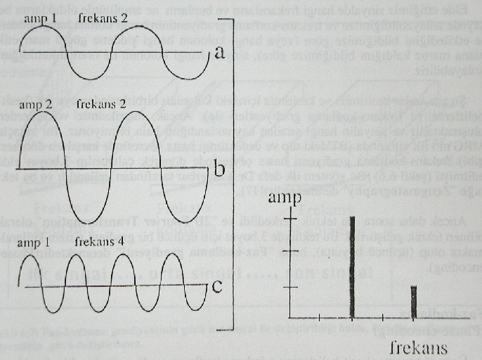 Bu gradiyente bağlı olarak, kesitte farklı salınım frekansları gösteren kolonlar oluşacaktır. Ancak bunu yaptığımızda; yani, kolonlar arasındaki salınım frekansları değiştirildiğinde, bu kolonlar arasında in-phaseinde bozulmasına neden olacaktır. Bunu engellemek için, bu uygulamadan önce dephaser olarak adlandırılan uygulama yapılır (bunun nasıl uygulandığı, puls diyagramları başlığı altında daha detaylı olarak tartışılacaktır) ve bu sayede sinyal kaydının yapıldığı anda kolonlar arasında in-phase ile birlikte, kolonlar arasında frekans farklılıkları sağlanır. Bu durumda elde edilen sinyal tek bir sinyal olmakla birlikte, farklı frekansları içeren kompleks bir yapı gösterir. Bu kompleks sinyali çözümlemek, yani sinyalde hangi frekansların hangi amplitütlerde olduğunu anlamak mümkündür ve bu işlem Fourier Transformasyon olarak bilinir (Şekil 6.5).